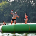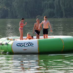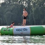 Zelte und freien Zugang zu einem See mit u. a. einem schwimmenden Trampolin, Volleyballplatz und Tischtennisplatten.