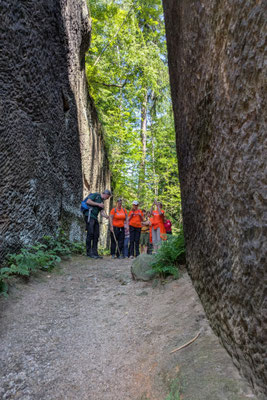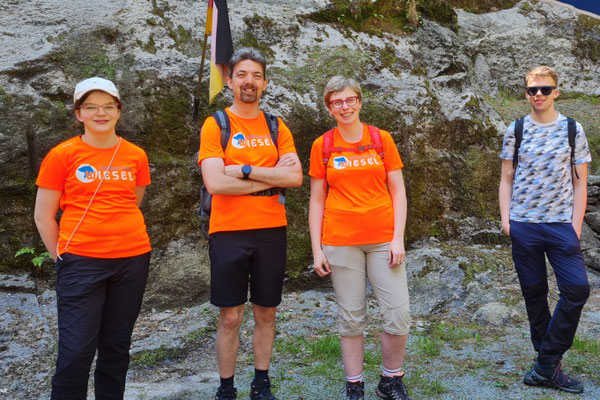 Am 14. Juni 2025 ging es für uns WIESEL zum 14. Sächsischen Wandertag nach Jonsdorf am Zittauer Gebirge, dem kleinsten Gebirge Deutschlands. Die ca. 13 Kilometer lange Wanderung führte uns entlang der sogenannten Mühlsteinbrüche – ehemaligen Steinbrüchen in denen große Mengen an Sandstein abgebaut und zu Mühlsteinen verarbeitet wurden. Der Weg bot uns schöne Aussichten über das Zittauer Gebirge, führte vorbei an eindrucksvollen Sandsteinformationen und durch größere Felsspalten. Immer wieder begegneten uns auf dem Weg auch alte Mühlsteine, die heutzutage als Anschauungsobjekte und Denkmale in der Natur belassen werden. Nachdem wir uns im sogenannten „Schwarzen Loch“, dem größten der Mühlsteinbrüche stärken konnten, wanderten wir weiter Richtung Ziel. Dort erwarteten uns neben Speis, Trank und traditioneller Zittauer Musik auch unser fünfte Wimpel, welcher nun seinen Platz an unserem Wimpelbaum erhalten hat.